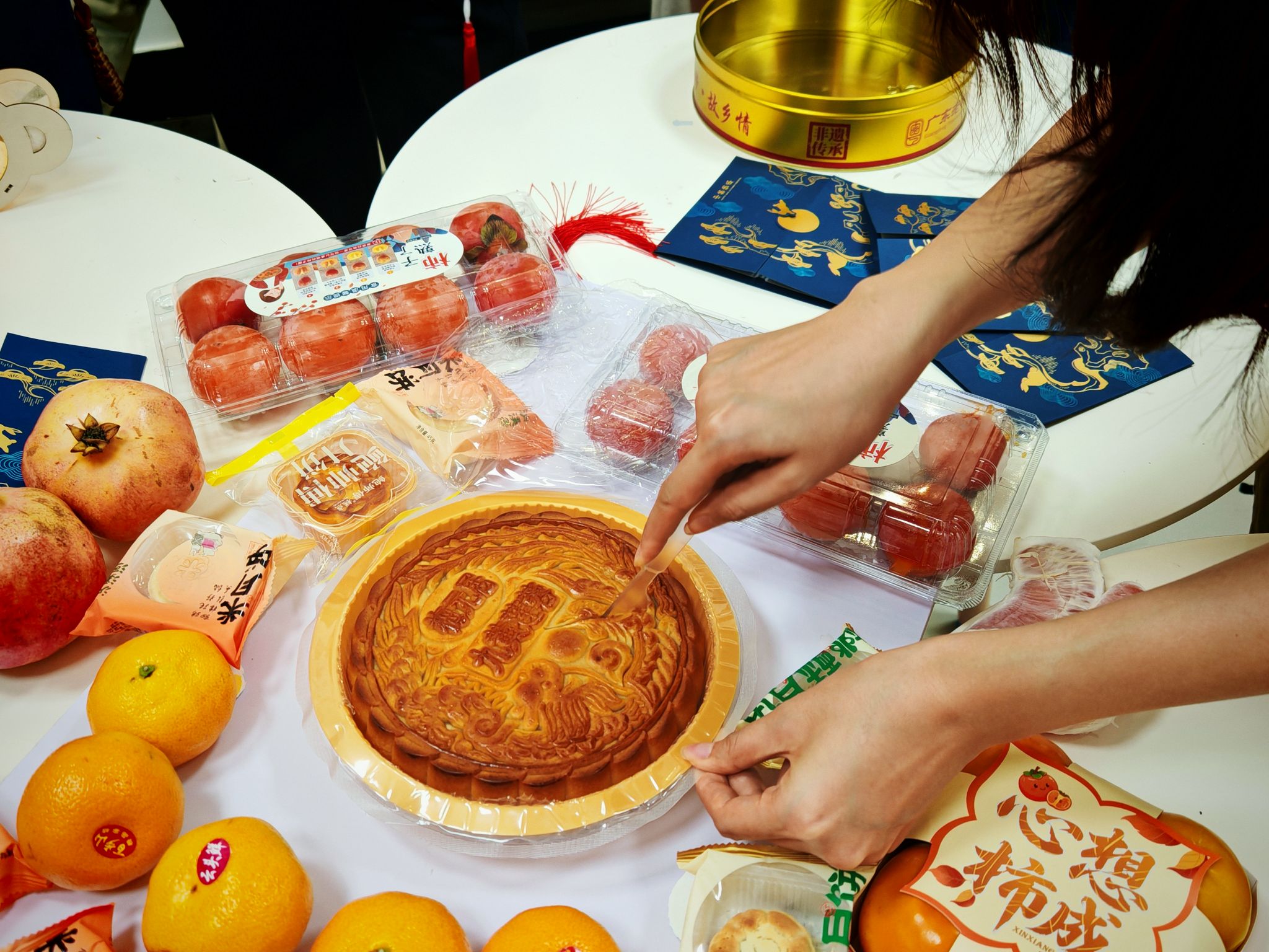活动现场的布置更是“心意满满”。经典五仁月饼承载“五谷丰登、家国安康”的美好祝愿,清真风味则体现尊重理解,求同存异;正中放置的10寸大小莲蓉蛋黄月饼象征“团圆圆满”。周围搭配的各色水果:石榴颗颗紧密,喻指“各族学子同心共聚”;柿子饱满红润,取“事事如意”之吉兆;橘子圆润金黄,寓意“吉祥满堂”;柚子清润芬芳,寄托“佑平安、盼顺遂”的美好愿望。
